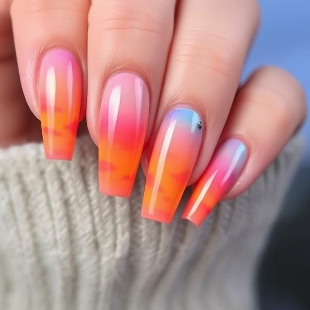 Ombre nails remain a favorite, and for 2025, they’ve been reimagined with a sun-kissed twist. “Sunset Ombre Dreams” features a rich gradient that transitions from warm golden yellows and oranges to deep pinks and purples, mimicking the colors of a setting sun. On long nails, this effect feels both dramatic and serene, creating a visual masterpiece. The beauty of this design is its versatility—you can create a subtle, soft transition or a bolder, more defined blend. Finish with a glossy top coat for a sunlit sheen or a matte finish for a sophisticated look. Add delicate white lines or gold foil at the base for a luxe touch, or let the colors stand on their own.