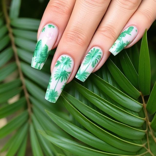 Capture a tropical escape directly on your fingertips with “Tropical Palm Paradise.” This design features vibrant greens, blues, and sandy neutrals, accented with chic palm tree silhouettes or sunset-inspired scenes. The blend of emerald greens, ocean blues, and bright coral instantly transports you to a warm destination. You can create a full palm tree landscape across all your nails or use them as subtle accents on a neutral base. For a dynamic contrast, try using a matte finish for the palm trees against a glossy background. The end result is a playful, relaxed manicure that is perfect for any beach-ready occasion.