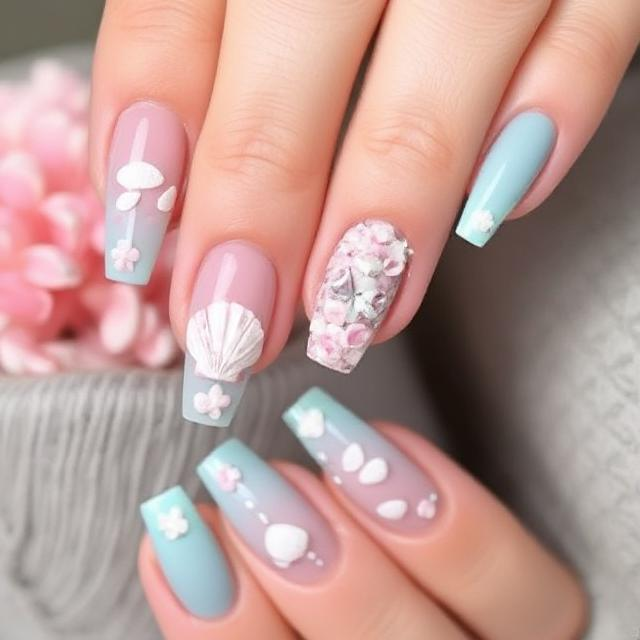 “Seashell Accents” brings the beach to your fingertips with beautiful designs inspired by ocean treasures. Long nails provide the space to play with intricate seashell, pearl, and starfish motifs, adding a bit of the ocean’s natural beauty to your manicure. Use soft, beachy hues like seafoam green, coral, and ivory for the perfect palette. Adding delicate pearl or rhinestone accents gives the design a luxurious, three-dimensional feel, making each nail a tiny work of art. This design feels both sophisticated and playful, perfect for someone who loves the beach but wants a more elegant, polished summer look.