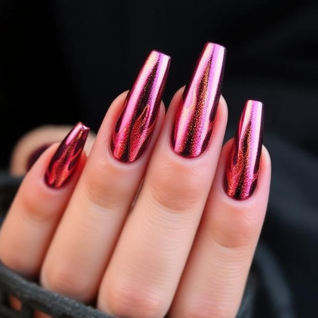 For a daring, edgy look, “Metallic Chrome Flames” offers a futuristic twist on summer nails. This design uses bold chrome finishes, transitioning into flame-like accents at the tips of your long nails. Imagine sleek metallic shades like silver, rose gold, or holographic chrome combined with the sharp, energetic lines of flames in black or neon. The result is a fiery, striking look that blends bold metallics with modern design. This manicure is perfect for someone who wants to make a statement—ideal for nights out, music festivals, or whenever you want to feel extra confident and edgy.