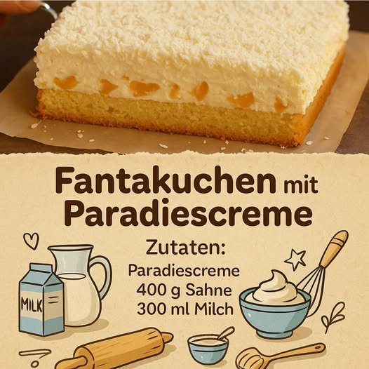 Perfekt! Das ist ein Rezept für einen Fanta-Kuchen mit Paradiescreme, ein klassischer und beliebter Blechkuchen in Deutschland, der besonders saftig und locker wird. Die Zugabe von Fanta macht den Teig wunderbar fluffig und gibt eine leichte fruchtige Note.